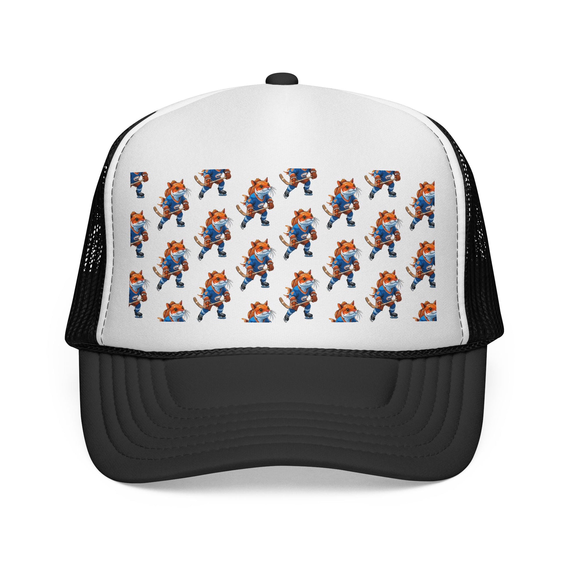 Foam trucker hat with a vibrant printed GOAL'Dfish and adjustable snapback closure.