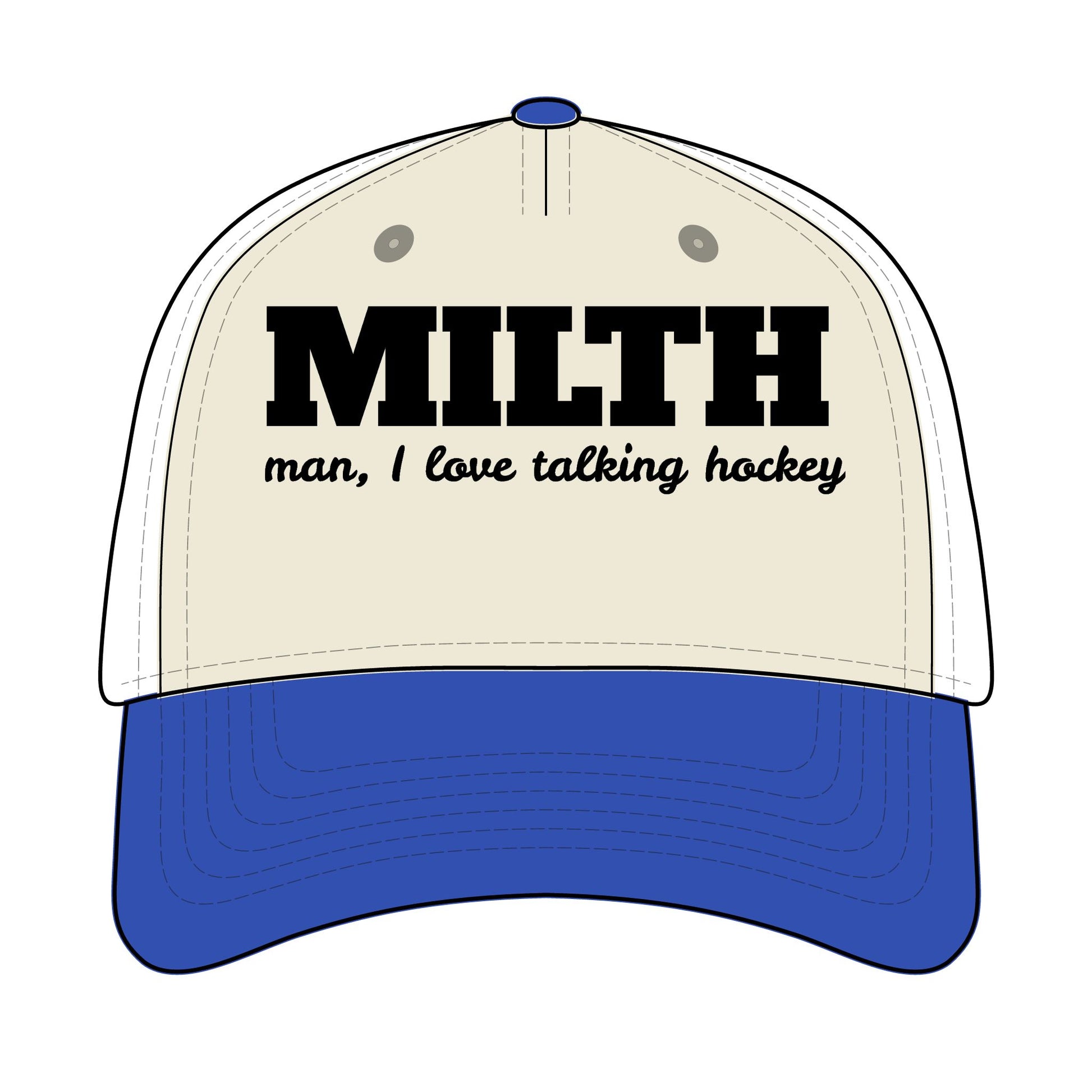 MILH Man, I Love Talking Hockey two tone mid-crown snapback hat with black thread embroidered text.