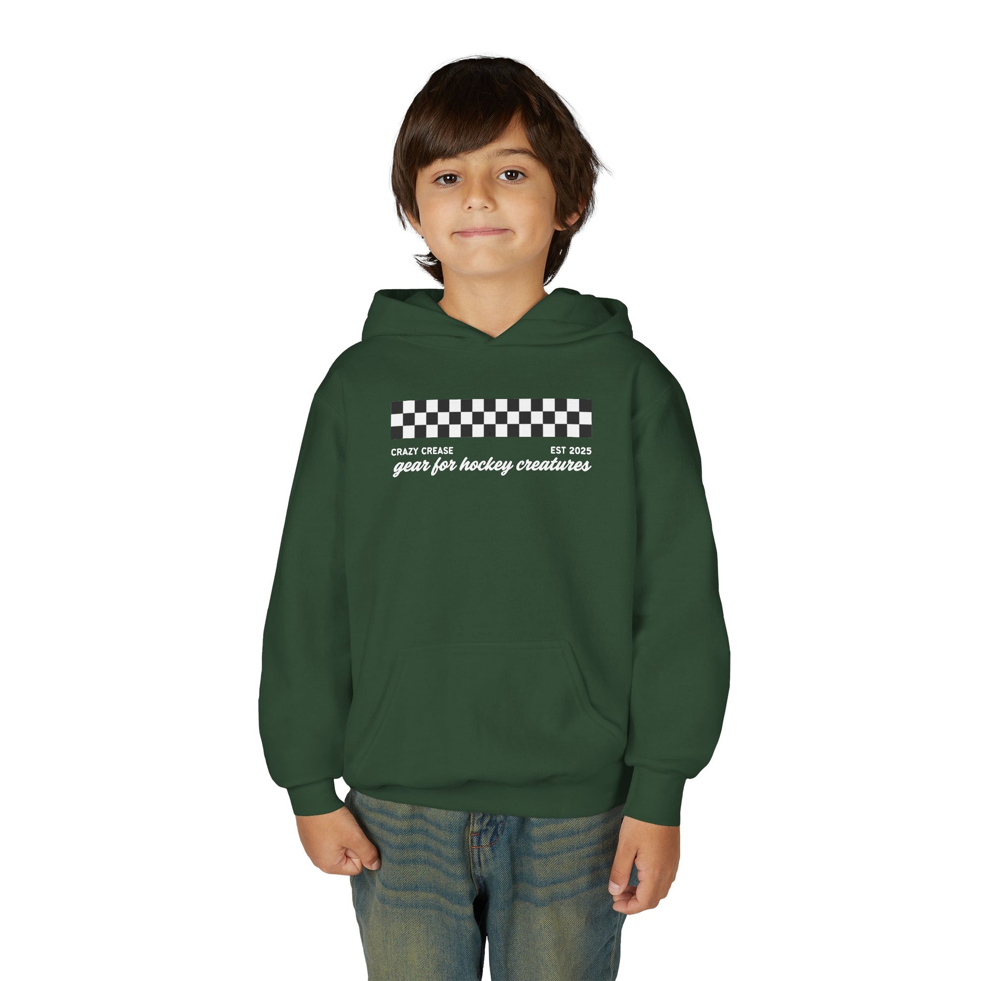 This youth hooded sweatshirt is a made from a soft and durable 50/50 cotton-polyester blend and is regualr fit/true-to-size. The hoodie features a front kangaroo pouch pocket and is ideal for keeping crease creatures cozy at school, home, or the rink!